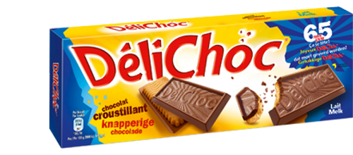 Created in 1957, Délichoc has become a beloved classic. We describe it as the opposite of a sandwich cookie, a crispy shortbread in a delicious milk chocolate case.