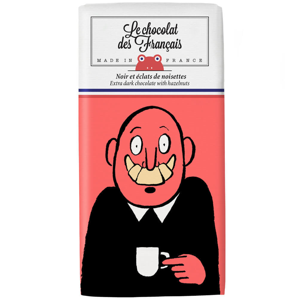Melt for Mr. Croissant which embodies the coffee-break cliché. Discover the sweet bitterness of this organic dark chocolate 71% associated to caramelized hazelnuts.