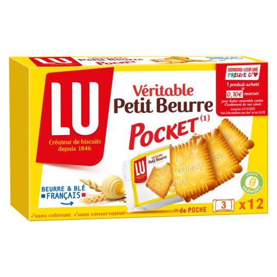 The LU Petit Beurre Pocket offers a practical and convenient pocket format, with individual bags containing 3 cookies each in a package of 12. Ideal for on-the-go snacking.