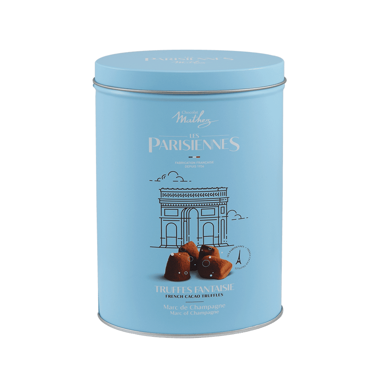 These incredibly creamy Champagne-flavored chocolate truffles dusted with cocoa powder come in an elegant oval tin celebrating the City of Light. A lovely gift idea!